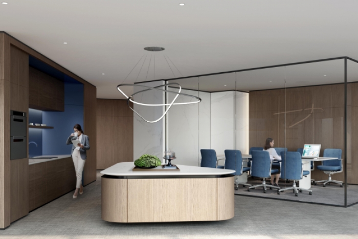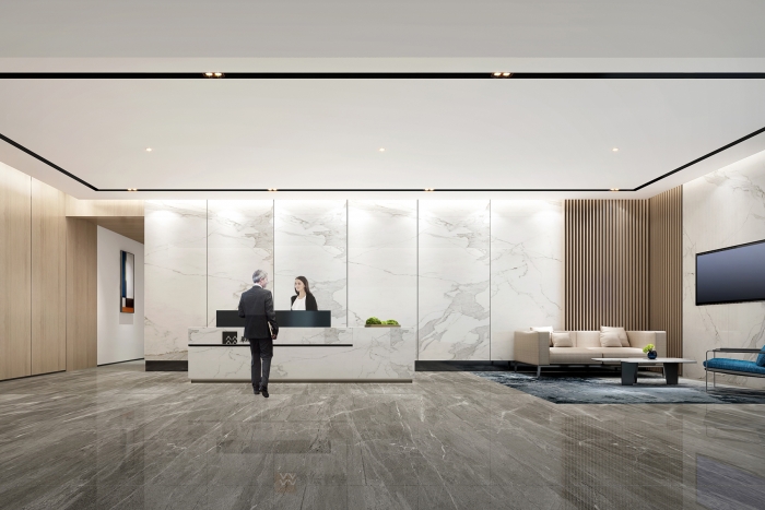 该办公楼装修设计中,接待大厅设计尤其重要,首先设计师根据企业需求和空间大小,合理规划空间布局,确保功能区域的设置既美观又实用;选用高品质的装饰材料,如大理石、高档涂料和精致的吊灯等,以提升整体质感;提供舒适的座椅、茶几和咨询台等家具,确保来访者的舒适度和满意度;采用柔和、自然的照明设计,营造舒适的接待环境。同时,设置适...